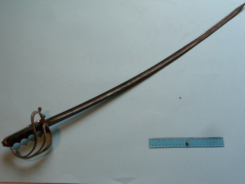 Lama curva a filo, punta e controfilo; sgusciatura sui due lati per i primi tre quarti; per l'ultimo quarto doppio sguscio con punta ribassata alla pandura. Incisa ad acido per metà a motivi militari e floreali. Motivo floreale anche sul dorso. Fornimento tipico con guardia e due elsi sottili. Corto ramo di parata a riccio con conchiglia per il pollice. Cappetta lunga, arrotondata, con dorso zigrinato nell'ultimo quarto. Bottone piatto, ovale, avvitato al codolo. Impugnatura anatomica.