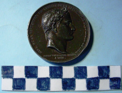 Di forma circolare. Sul recto, al centro, in rilievo, busto laureato, accollato a destra di Napoleone I. Iscrizioni lungo la corona e sotto la figura. Sul verso, al centro, in rilievo, la rappresentazione del ritorno delle ceneri di Napoleone I a Les Invalides. da destra portantini con la cassa sulle spalle nell'atto di salire una rampa di scale verso Marianna incoronata, che regge rami di palma e d'ulivo. A sinistra Tanatos che spegne una torcia e che regge una tavola con iscrizione appoggiata ad una colonna. In secondo piano, a destra, un veliero che spara una salva di cannone e, a sinistra, la cappella di San Luigi degli Invalidi. nella parte superiore la figura di Napoleone I a spada sguainata che cavalca un'aquila tra nuvole raggianti. Ulteriore iscrizione in esergo.