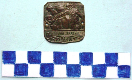 Di forma ottagonale con i lati inferiori arrotondati. In primo piano, in rilievo a sinistra, un gruppo composto da una figura femminile che stringe al petto un bambino, a destra una figura maschile, con giacca e cappello, con un piccone tenuto sulla spalla e braccio destro proteso. In secondo piano una fabbrica con ciminiere fumanti. Ai lati due fori di fissaggio. Iscrizioni nella parte inferiore.