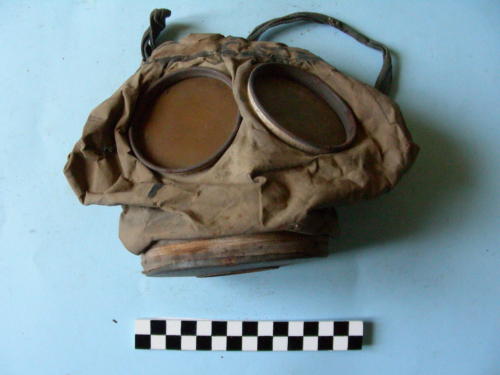 Facciale con due lenti circolari contornate da lamierina metallica, sei lacci di fissaggio alla nuca cuciti al bordo e raccordati. Alloggiamento per il filtro con foro filettato alla base. Facciale con tela mimetica.