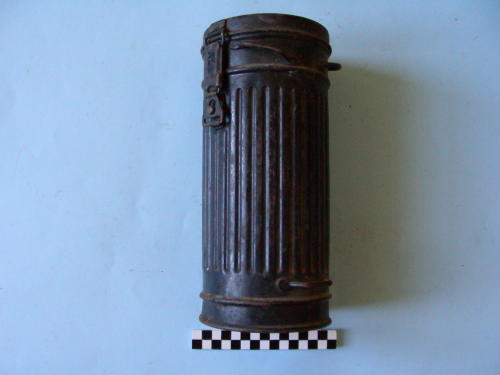 Di forma cilindrica, con scanalature verticali; coperchio con chiusura a gancio a molla. Tre magliette di fissaggio della tracolla; le due magliette superiori sono in posizione diagonale. Verniciatura di colore verde scuro. All'interno del coperchio è presente un contenitore quadrato, con angoli arrotondati e molla all'interno.