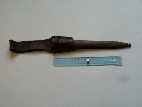 Liscio, con bocchetta allargata trattenuta da ribattini, bottone fermatasca e puntale arrotondato. Presente anche la tasca.