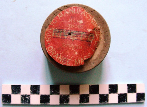 Di forma circolare, con chiusura ad incastro, lungo la faccia laterale incise a tornio 5 scanalature. Etichetta di colore rosso sulla faccia superiore.