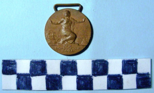 Di forma circolare. Sul recto, al centro, in rilievo figura allegorica femminile inginocchiata sull'esergo, sullo sfondo tetti di una citta. Iscrizioni in esergo e a sinistra sotto i tetti. Sul verso, parte superiore una bandiera sventolante con stemma sabaudo. Iscrizioni in rettangolo nella parte inferiore ed in alto lungo la corona.