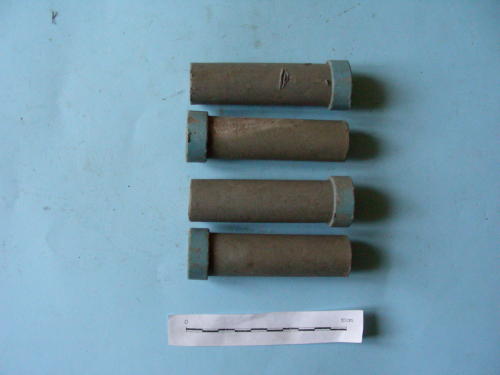 Quattro tubi, cavi, con fondello a tre fori circolari disposti a triangolo e imboccatura estroflessa di colore azzurro.