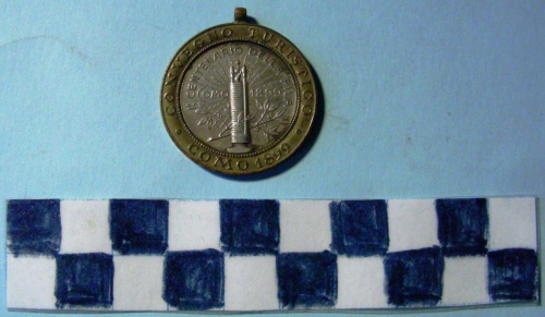 Di forma circolare, bimetallica di colore oro ed argento. Sul recto, al centro, in rilievo entro corona d'alloro il busto a destra di Alessandro Volta. Iscrizioni lungo la corona interna e a sinistra della figura. Sul verso, al centro, in rilievo su ramo d'alloro pila raggiante. Iscrizioni lungo la corona esterna, interna e ai lati della figura.