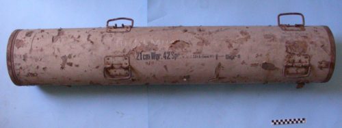 Di forma cilindrica, cavo, con due imboccature metalliche e 4 maniglie per il trasporto. Due ganci di fissaggio per il coperchio. Restringimento alla base inferiore interna per alloggiamento del razzo.