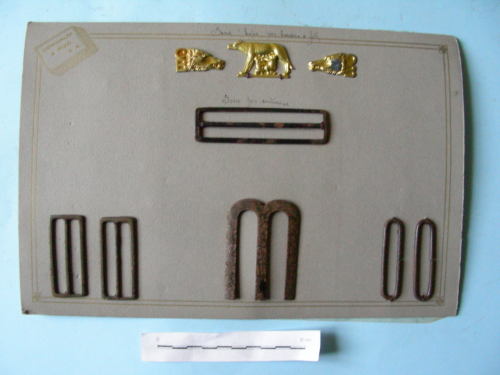 Pannello grigio decorato con cornice dorata a stampa. Vi sono attaccati tre fregi, di cui due a forma di testa di lupa, uno verso destra, uno verso sinistra; con gancetto sul retro e uno a forma di lupa verso sinistra nell'atto di allattare i gemelli Romolo e Remo. Inoltre cinque fibbie e monogramma "M". Sul retro il filo e i gancetti sono schermati da un foglio di carta. Una carta velina fissata solo sul lato superiore ricopre la parte frontale del campionario.