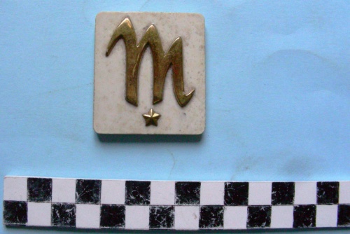 Su una base rettangolare di colore bianco monogramma e stelletta sottostante entrambi dorati. Sulla faccia posteriore tre linguette per il fissaggio.