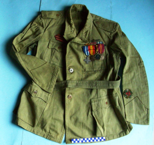 In tela color kaki, sfoderata, due tasche e due taschini applicati e chiusi da patte sagomate e bottoncini. Chiusura a quattro bottoni. Controspalline mobili con la parte inferiore inserita in un passante. Cintura alla vita inserita in due passanti e fibbia di chiusura. Sulle maniche all'altezza dei polsini mezza losanga di colore marrone.