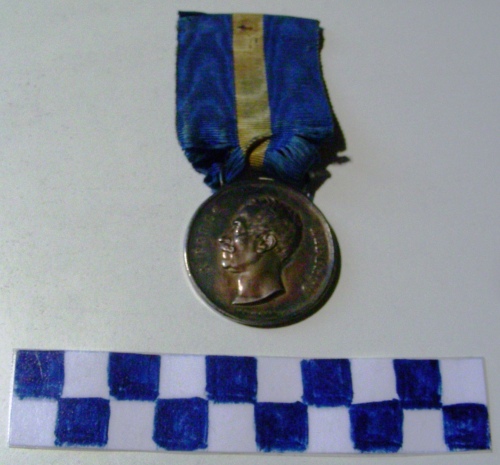 Di forma circolare. Sul recto, al centro, in rilievo busto accollato a sinistra di Carlo Alberto. Iscrizioni ai lati della figura e sotto di essa. Iscrizioni sul verso. Nastrino tripartito blu con al centro linea gialla.