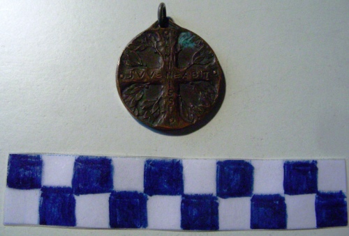 Di forma circolare. Sul recto, al centro, in rilievo, una croce formata da un tronco d'alloro con rami e foglie. Iscrizione sui bracci. Sul verso, iscrizione tra corona d'alloro e stella raggiante a cinque punte su paesaggio montano. Anello all'appiccagnolo