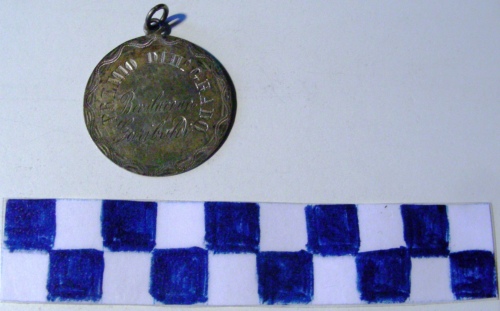 Di forma circolare. Sul recto, decorazioni geometriche lungo la corona con iscrizioni al centro. Sul verso decorazioni geometriche lungo la corona con iscrizioni al centro. Anello all'appiccagnolo.