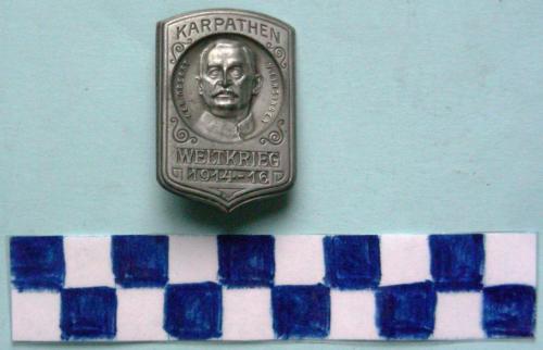 A forma di scudo con al centro, in tondo, in rilievo il volto di un alto ufficiale con iscrizione. Ulteriori iscrizioni sui lati superiore ed inferiore. Sul verso spilla di fissaggio