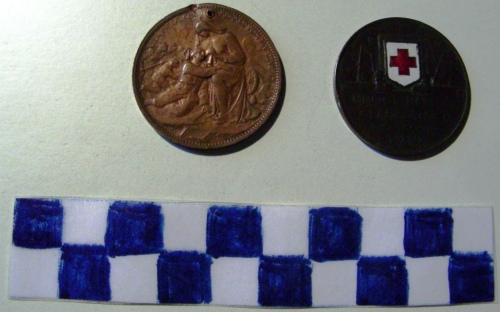 Di forma circolare. Sul recto, al centro, in rilievo, entro cerchio perlinato, figura allegorica femminile, velata, nell'atto di soccorrere un ferito. Sullo sfondo, un gruppo di soldati in azione a sinistra e cannone sulla destra. Iscrizione lungo la corona e nella parte inferiore. Sul verso, in perlinato , croce smaltata in rosso in campo bianco racchiusa in un rettangolo ornata da rami d'alloro. Ai lati, baionette incrociate. Iscrizione nella parte inferiore.