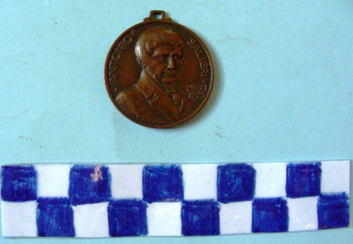Disco di metallo, sul dritto in bassorilievo il profilo a mezzobusto di Antonio Salieri volto a destra, iscrizione lungo la corona. Sul verso, in bassorilievo, un albero fogliato con sottostanti 5 stemmi comunali coronati, da sinistra il primo di Legnago, il secondo crociato con la testa di Virgilio per Mantova, il terzo, di dimensioni maggiori, crociato per Verona, il quarto crociato per Vicenza, il quinto crociato con due draghi alati nei primi due quartieri per Belluno il tutto a formare il logo della Cassa di Risparmio di Verona, Vicenza, Belluno ed Ancona.