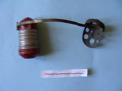 Involucro conico scanalato con parziale verniciatura di colore rosso e cinque aperture orizzontali; coppiglia a striscia fissata ad una delle aperture e alla sicura aerea; sicura aerea con calotta a sette fori circolari e visierino a sette fori di forma variabile.