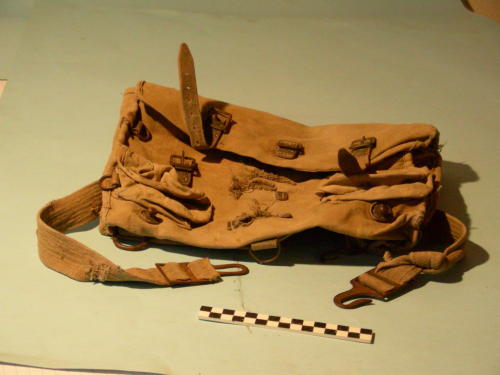 Di forma rettangolare, floscio, due magliette cucite una al centro e l'altra sull'alloggiamento dello spallaccio destro. Patta di chiusura con due cinturini e fibbie per chiusura a due fibbie cucite sulla parte anteriore, ulteriore fibbia per un cinturino d'affardellamento cucito al centro sulla parte centrale della patta. Due piccole tasche esterne applicate ai lati e 2 perni di fissaggio. Due magliette applicate alle estremità del lato sinistro. Quattro magliette applicate alla base, due al centro per l'affardellamento e due ai lati, una terminante con un gancio per l'aggancio degli spallacci. Sulla parte superiore del dorso due spallacci inseriti in profilature di cuoio, terminanti con due ganci ed una maglietta triangolare. Due magliette applicate sulla parte inferiore. Sui lati due asole sulla parte superiore, due fibbie nella parte centrale e due magliette alla base. All'interno sul dorso esterno sono applicate due piccole tasche con chiusura ad asola e bottone.