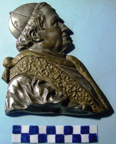 Busto a destra di Pio IX con berretto, mozzetta e stola dorata e decorata a motivi floreali e con le chiavi vaticane.