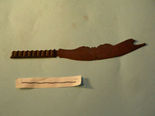 Lama ricurva a forma di scimitarra, a doppia punta e dorso sagomato. Filo unico. Lama decorata ad incisione a motivi zoomorfi.