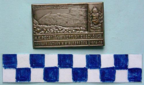 Di forma rettangolare diviso in cinque riquadri, primo superiore di sinistra, paesaggio montano con rocce in primo piano. Sullo sfondo alberi stilizzati e montagne con iscrizione in alto a sinistra. Nel secondo di destra, scudo araldico dell'Ungheria. Nei tre restanti riquadri iscrizioni. Sul verso, spilla di fissaggio.