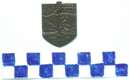 A forma di scudo, con in rilirvo, nella parte centrale, in posizione verticale una mazza ferrata con sottostante ramo d'alloro su un paesaggio montano con strada in salita verso sinistra. Sul verso spilla di fissaggio ed iscrizione.