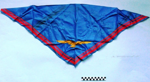 A forma di triangolo isoscele di tessuto azzurro, bordato con due strisce di colore rosso, di diversa grandezza su due lati. Aquila dorata ad ali spiegate stampata al centro.