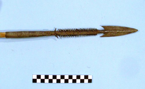 lama a punta di freccia con incisioni in zona centrale; punta a sezione a losanga irregolare con nervatura centrale. Gambo estremamente frastagliato con punte rivolte verso lasta e incisioni decorative nelle parti liscie; gorbia decorata con incisioni geometriche. Asta non originale, senza puntale.