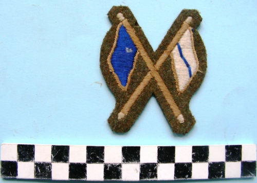 Due bandiere incrociate e ricamate su una base di panno color cachi. La bandiera di destra di filo bianco con una banda azzurra trasversale. La bandiera di sinistra di filo blu.
