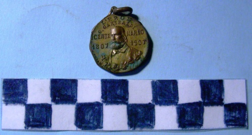 A forma di decagono. Sul recto, al centro su rami d'alloro, il busto di tre quarti di Garibaldi con iscrizioni. Sul verso, tra iscrizioni, un'aquila ad ali spiegate che stringe con gli artigli della zampa destra un fascio littorio e con la sinistra un serpente che col becco ha spezzato in due. Anello all'appiccagnolo.