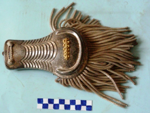 Di metallo argentato, di forma arrotondata, con due bottoni decorati ad incisione ed alamaro all'estremità inferiore, 11 scanalature sagomate nella parte centrale e bordo superiore con rilievo semiellittico che contiene un caduceo. Frange in canottiglia argentata applicate al bordo superiore. Sulla parte posteriore, vite di fissaggio, piastrina metallica ed imbottitura.
