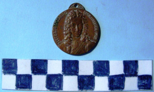 Di forma circolare. Sul recto, al centro, in rilievo il busto di fronte di Vittorio Amedeo di Savoia. Iscrizioni lungo la corona e sulla spalla a sinistra. Sul verso, iscrizione al centro, in rilievo. A destra ramo di quercia