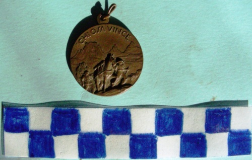 Disco di metallo, sul dritto in rilievo paesaggio montagnoso africano con in primo piano un gruppo di due soldati con mulo e cannone someggiato. Sul verso due cannoni incrociati sormontati da aquila ad ali spiegate. Scritte al centro e sulla corona.