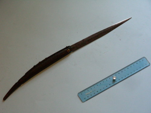 lama dritta, sottile, ad un filo. Punta simmetrica al centro. Impugnatura leggermente ricurva a seguire la linea del filo, decorata con motivi lineari geometrici. Molla dorsale di blocco della lama, con sgancio a presa circolare.