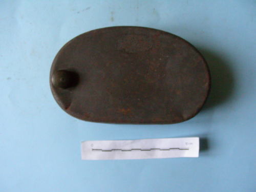 Di forma ellittica schiacciata su un lato; a due valve saldate. Apertura circolare con tappo a vite sulla faccia superiore. Verniciatura di colore grigio-verde.