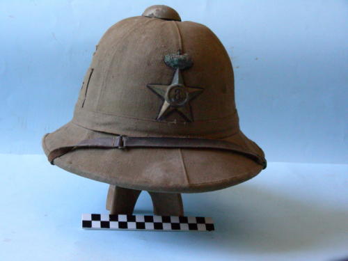 Calotta a sei sezioni sormontata da calottino in lamiera con tre fori di aerazione; tesa larga; due fori di aerazione laterale. Fascia posta sopra la tesa, fissata attraverso un passante. Taschino in posizione laterale. Di color kaki, rivestimento interno color verde. Sottogola a cinturino regolabile, posizionato sulla visiera, e fissato all'interno mediante gancetti. Fregio in posizione frontale.