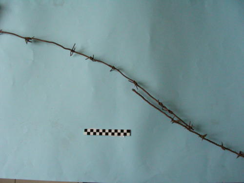Corda a filo unico quadrangolare con 10 triboli a quattro punte legata ad altro segmento di corda a tre fili ritorti con 5 spine tagliate a formare tre punte.
