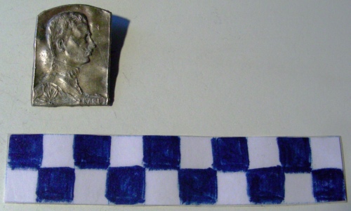 A forma di rettangolo con lato superiore arrotondato. Al centro, in rilievo, il profilo a destra, di Carlo I in alta uniforme. Iscrizione lungo il lato inferiore, a destra. Sul verso, spilla di fissaggio.