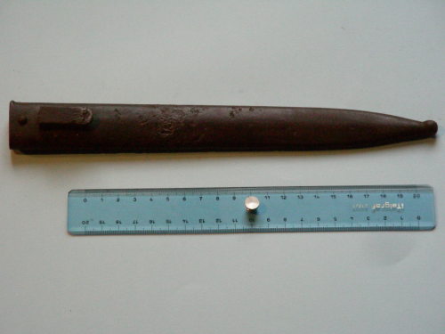 Liscio, con bocchetta allargata trattenuta da ribattini, bottone fermatasca e puntale arrotondato.