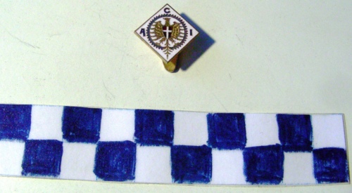 Di forma romboidale. Sul recto di colore bianco, un'aquila spiegata rivoltata con stemma sabaudo sul petto. Iscrizione ai lati della figura. Sul verso, fermaglio a forma di goccia rovesciata ed iscrizione.