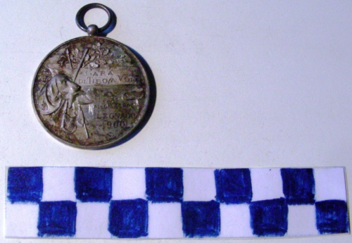 Di forma circolare. Sul recto, in rilievo da sinistra testa di un cane che stringe tra le fauci un uccello. Sottostanti un fucile ed una lancia incrociati, un corno da caccia, una fiaschetta da polvere ed un carniere. Nella parte superiore a destra iscrizione su un nastro. Ulteriore iscrizione sulla parte inferiore destra. Sul verso, iscrizione entro corona d'alloro e di quercia. Anello all'appiccagnolo.