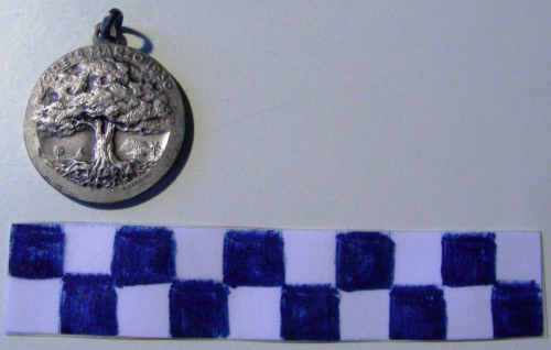 Di forma circolare. Sul recto, al centro, in rilievo albero con fronde che affonda le radici in una iscrizione. Sullo sfondo un paesaggio africano con montagne. Ulteriori iscrizioni lungo la corona. Sul verso, al centro, in rilievo il profilo di una montagna. Iscrizioni lungo la corona ed al centro sopra la figura. Anello all'appiccagnolo.