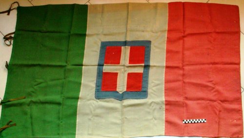 Tricolore con stemma cucito al centro. Tre serie di fettucce per il fissaggio.
