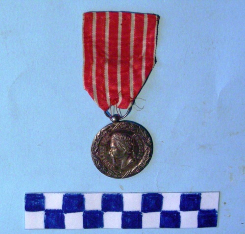 Di forma circolare. Sul recto testa laureata dell'imperatore a sinistra circodata da iscrizione, il tutto incorniciato da serto d'alloro. Sul verso al centro, iscrizione con il nome di sei battaglie circondata da una corona con ulteriore iscrizione, il tutto incorniciato da serto d'alloro. Nastrino a strisce verticali bianche su sfondo rosso.