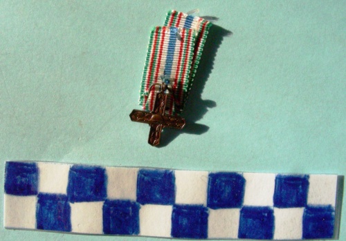 Distintivo mignon. Croce greca piena, incisa sul dritto, caricata di uno scudetto a forma di stella a cinque punte contornata da iscrizione, bracci decorati da rami d'alloro. Sul verso al centro in rilievo un elmetto Adrian e bracci decorati da rami d'alloro. Nastrino con ai lati i colori nazionali ripetuti due volte ed al centro una banda blu e due bianche ai lati.