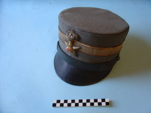 Di forma circolare con visiera prominente e sottogola a cinturino regolabile fissato alle tempie con due bottoni e posizionato sopra la visiera; fregio con stemma della Sanità in posizione frontale sovrapposto a banda e doppia striscia color oro. Interno foderato di colore viola.