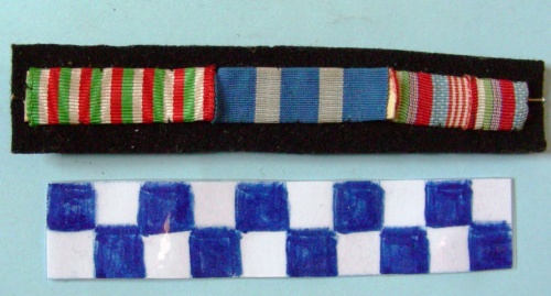 Su panno nero, cuciti su cartone 1) nastro col tricolore italiano verticale ripetuto sei volte per medaglia della guerra per l'unità d'Italia 2) nastro di tre bande azzurre intervallate da due bianche di minor dimensione per croce al merito di guerra, 4) nastro con tre bande verticali rosso bianco e verde, tre piccole bande blu bianco rosse ripetute due volte, una banda rossa, una banda blu a puntini bianchi e tre bande rosse intervallate da tre bande bianche, il tutto ripetuto una volta per decorazione non identificata.
