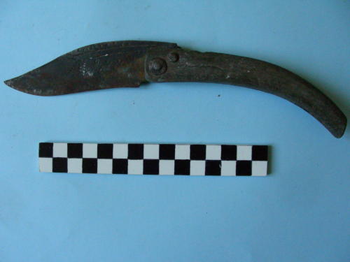 Lama ad un filo, leggermente ricurva, con dorso maggiormente incurvato e punta al centro; decorazioni incise al dorso, raffiguranti motivi di mezzelune e stelle. Impugnatura ricurva, con alloggiamento per la lama e bottone di blocco per l'apertura.