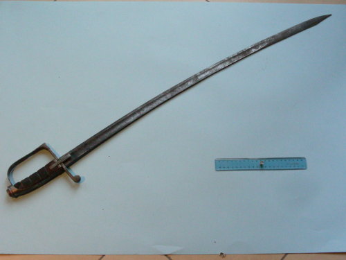 lama civile, curva, a filo, punta e controfilo. Ampie sgusciature sui due lati, per i primi tre quarti; liscia al debole. Punta ribassata alla pandura. Fregi ad acido a motivi militari e floreali su entrambi i lati della lama per la prima metà; motivo floreale anche sul dorso. Guardia a staffa ad un solo ramo; ramo di parata a riccio con spacco per dragona; alette fermafodero rettangolari; cappetta lunga con dorso sfaccettato. Impugnatura a settori zigrinati separati da quattro scanalature.