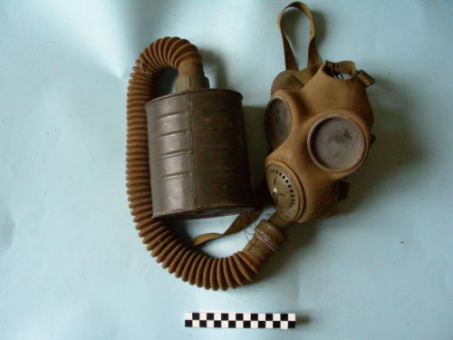 Facciale con due lenti circolari contornate da lamierina metallica e sei cinghie elastiche di fissaggio alla nuca fissate con rivetti al bordo e raccordate sulla nuca. Valvola circolare con bordo forato e sporgenza filettata a tronco di cono in posizione centrale; tubo di raccordo fissato ad ulteriore tubo corrugato che porta al filtro, a forma di parallelepipedo con base ellittica e scanalature orizzontali.